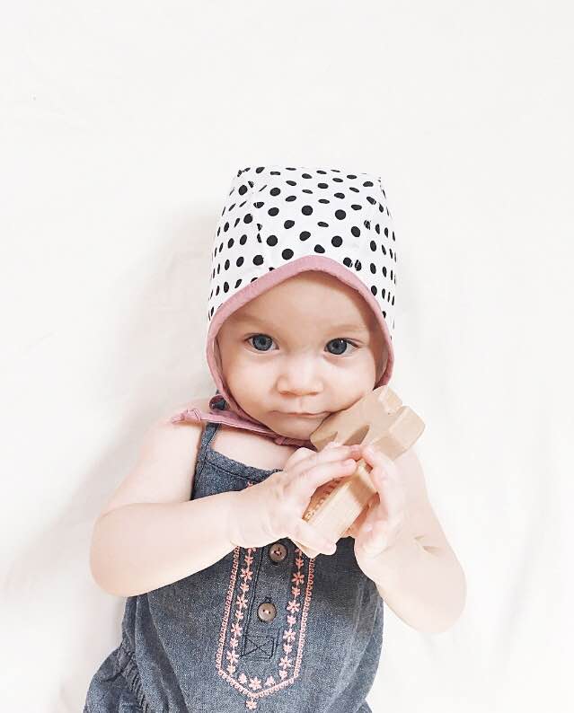 All grasping toys come sanded satin smooth and left natural with no finish.  The Bunny is approximately 3"x3.25" with a grasping hole in the center.