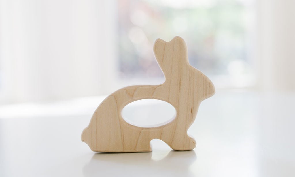 This sweet bunny is sure to bounce right in and make learning to grasp easier for your little one!  Made from rock hard maple wood, it is naturally anti-bacterial and non-splintering.