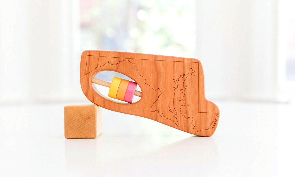 Show your state pride with this Maryland State baby rattle™.  This rattle is made from solid hardwood Cherry.  This baby rattle is 100% organic, made from responsibly harvested woods, and is sure to last long enough to be passed down through several generations in your family.  The finish is safe yet durable and made from an organic mix of flaxseed oil and locally grown beeswax.  Choose any 3 colors for your disks!