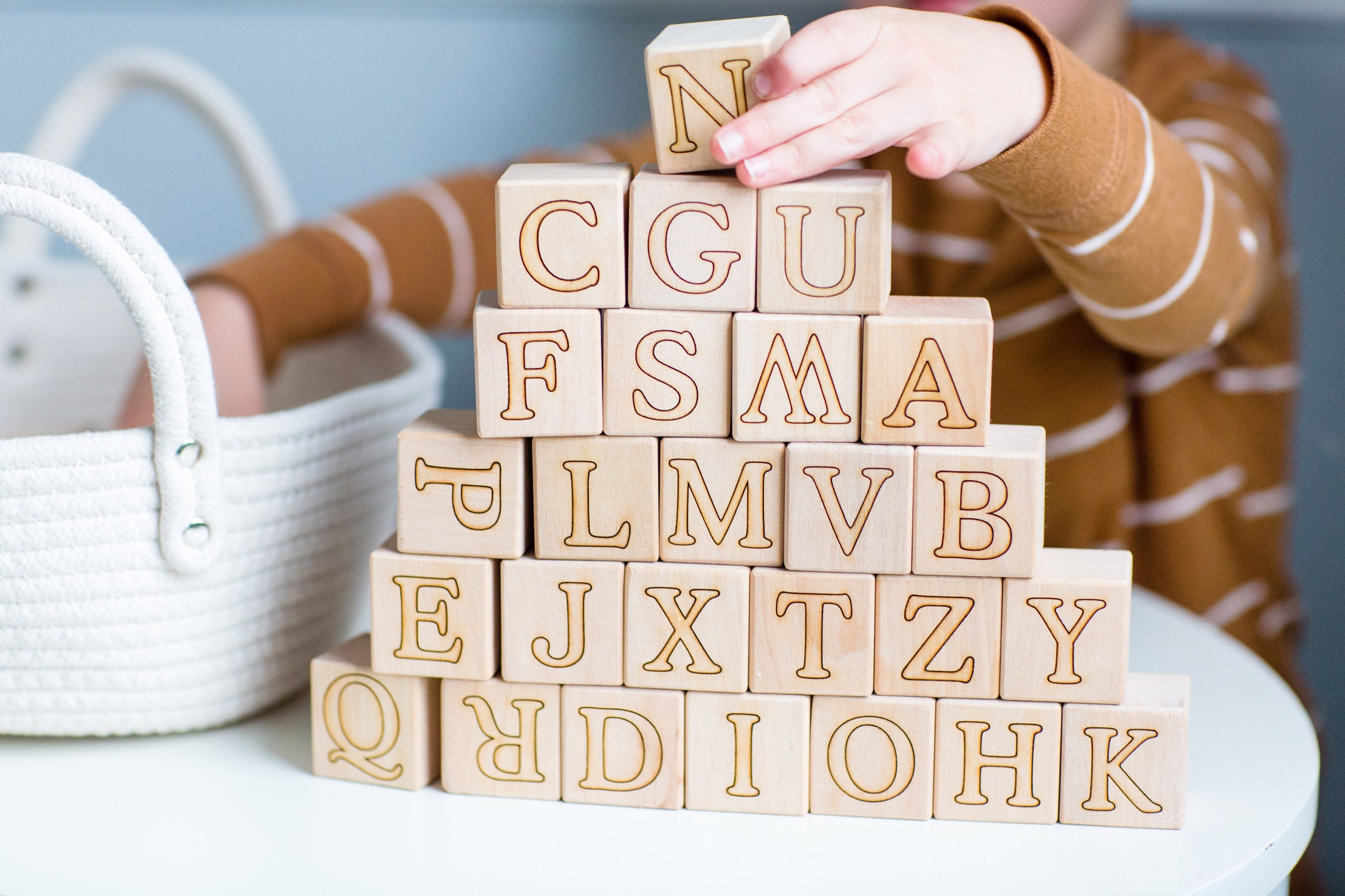 • 26 blocks have a capital on one side and corresponding picture permanently laser engraved on the back.