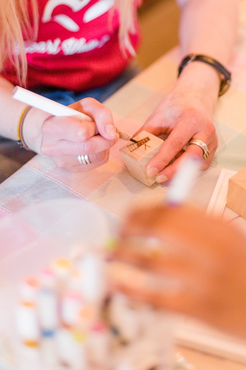 **We do not provide the writing instruments and cannot certify the safety of what you choose to use if your child is mouthing on the blocks.   Please choose something non-toxic and water based.   Once this set is colored on, it should be played with by children who are past the mouthing stage and do not chew on the blocks.   If you are using the set as is, just plain and lasered, they are certified safe for all ages.**