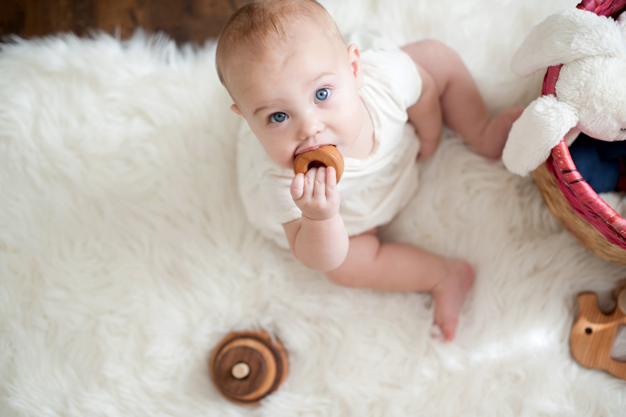 Yes, our wood is natural. We do not stain it. We use Maple, Cherry, Beech and Walnut woods and their natural colors. Our finish is a 100% organic beeswax and flaxseed oil mixture that is all natural and nontoxic so it is the perfect finish for baby's mouth. The oil brings out the color and the beeswax provides durability. Our paint is a water based, organic paint from a company in the United States. They are 100% safe, lead free, no VOC's, non-toxic and approved for use in children's toys. The glue we use is non-toxic too. Our grasping toys are left "naked", there is no finish on them.
