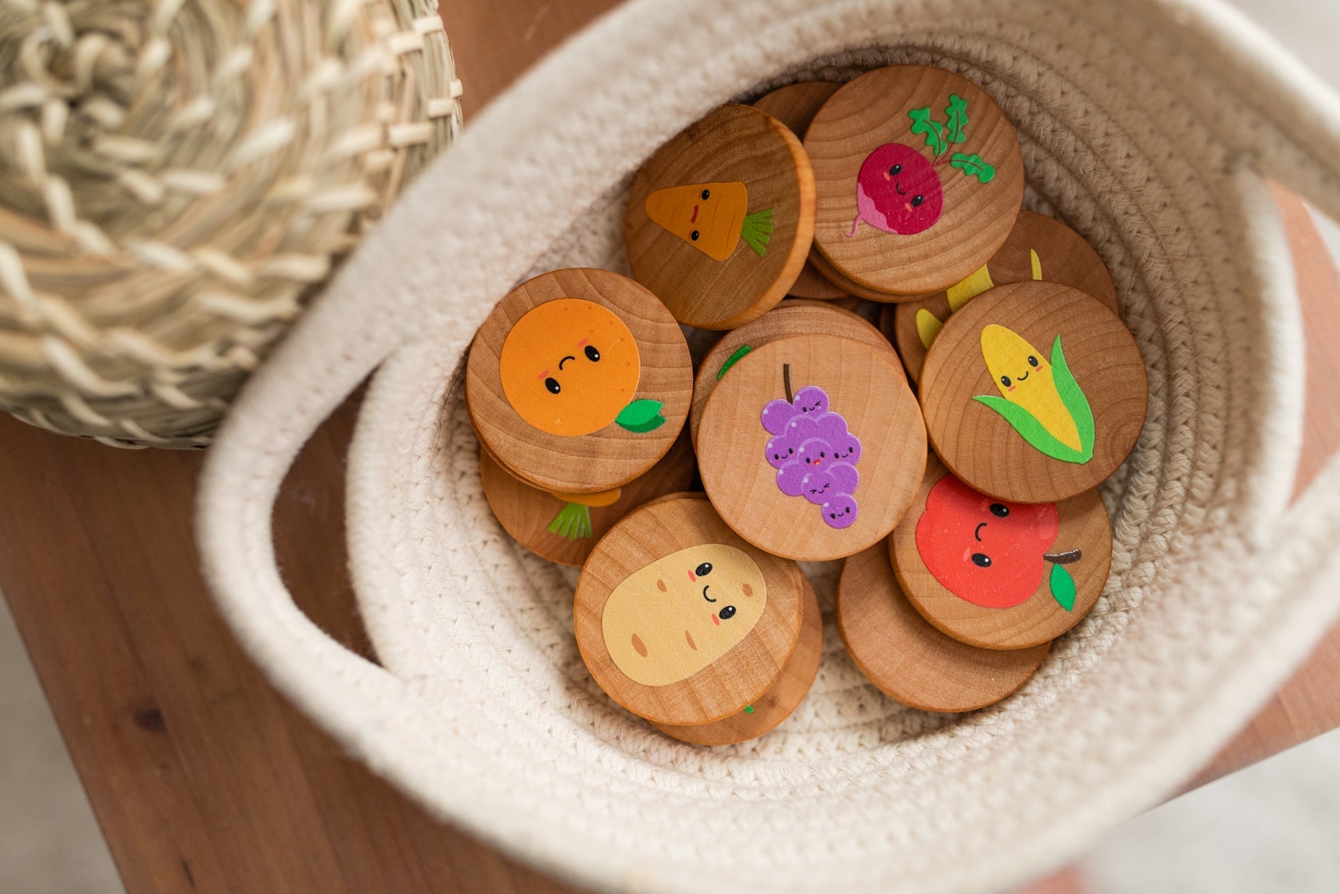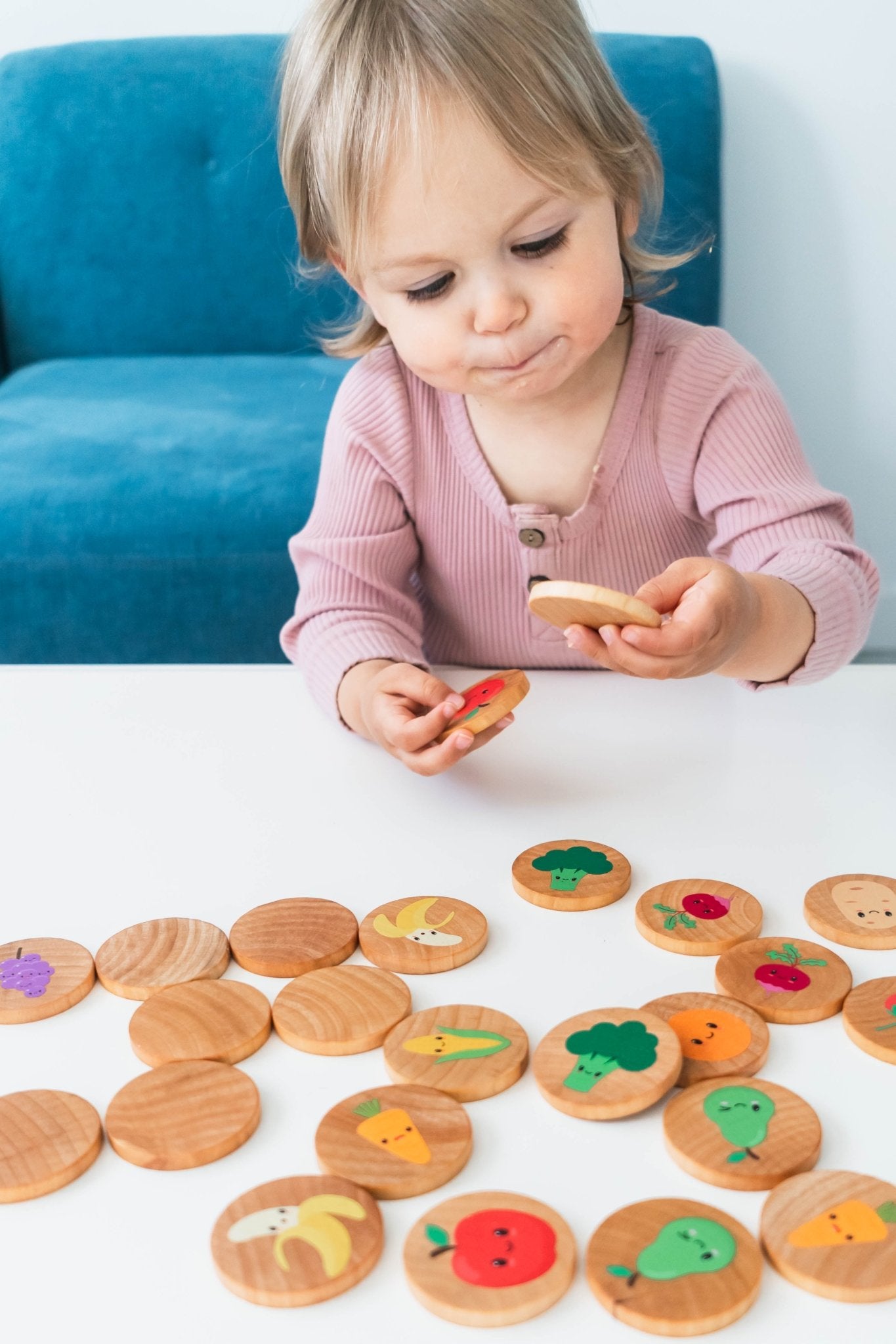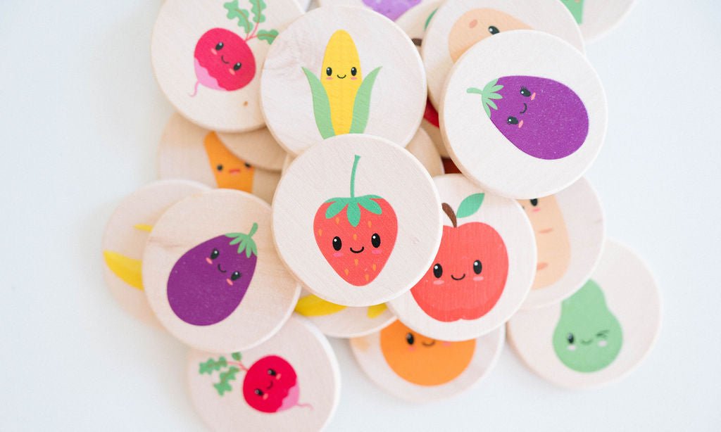 The fun fruits and veggies on our Farmer's Market Matching Tiles will make your child smile!  A fun game that can be enjoyed solo or with the entire family - teaching kids to take turns and share with others.  Our wooden matching tiles will also promote short term memory skills.  This set features 12 pictures of easily recognizable produce items: carrot, strawberry, corn, pear, orange, potato, radish, eggplant, apple, banana, grapes, and broccoli.