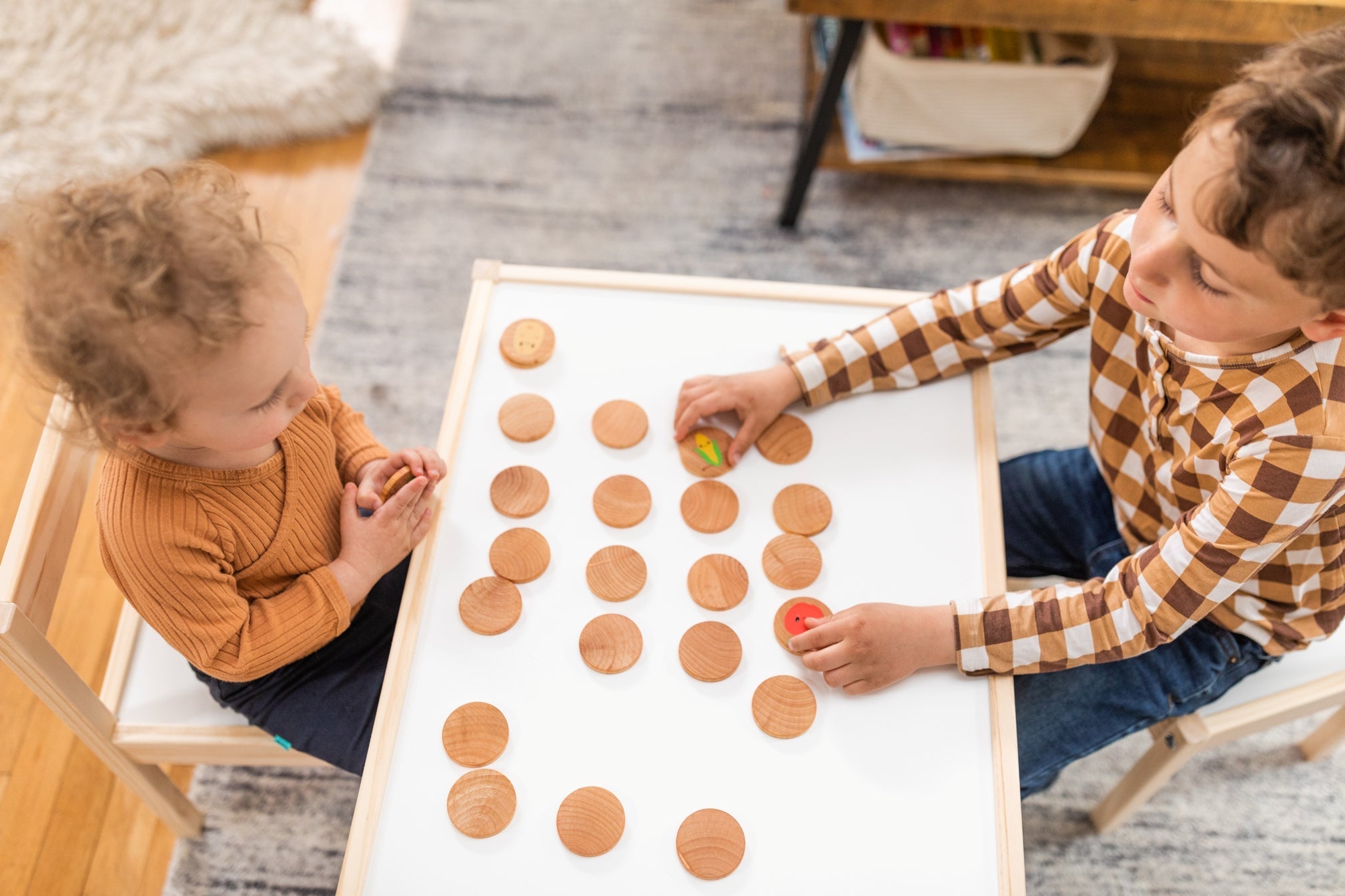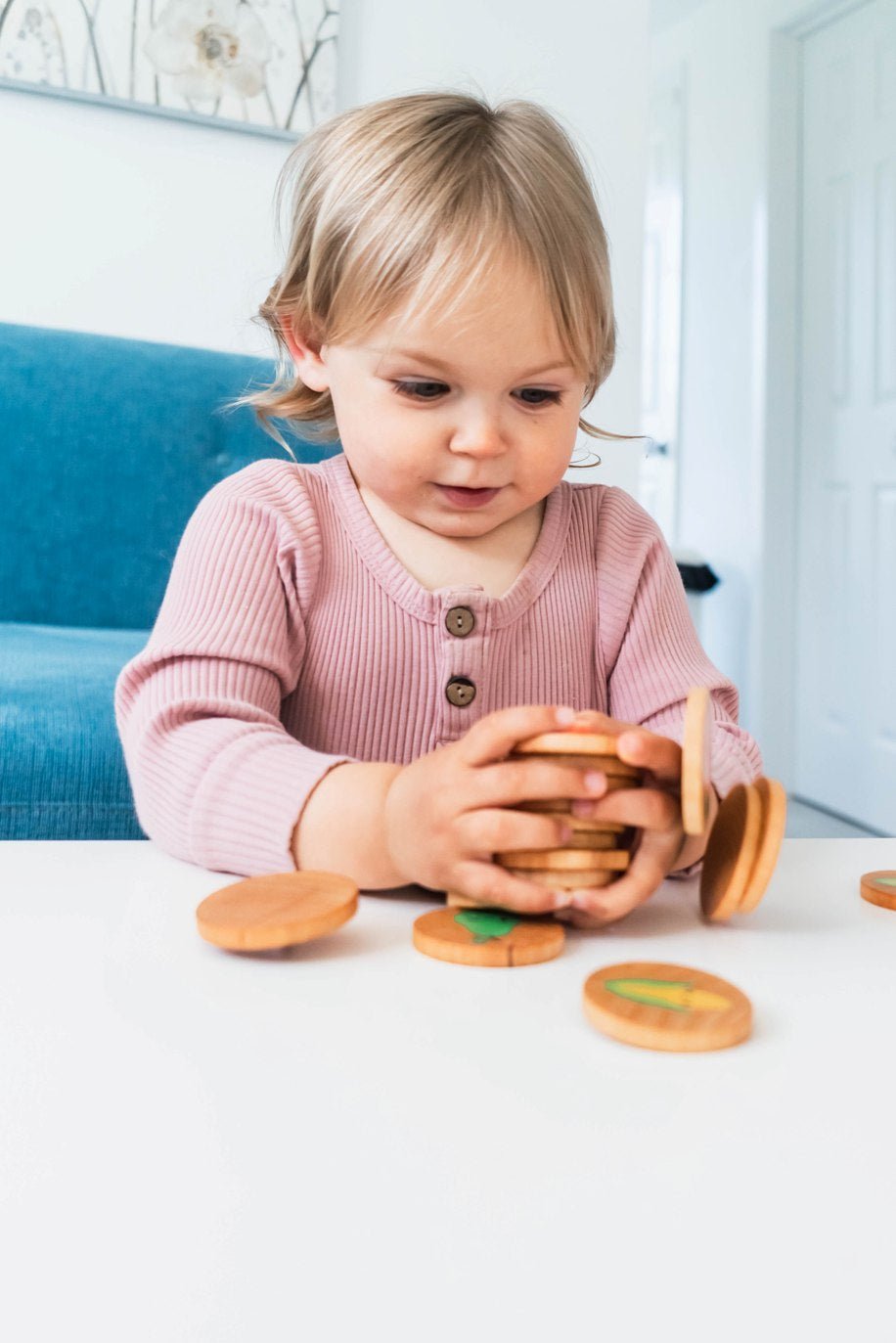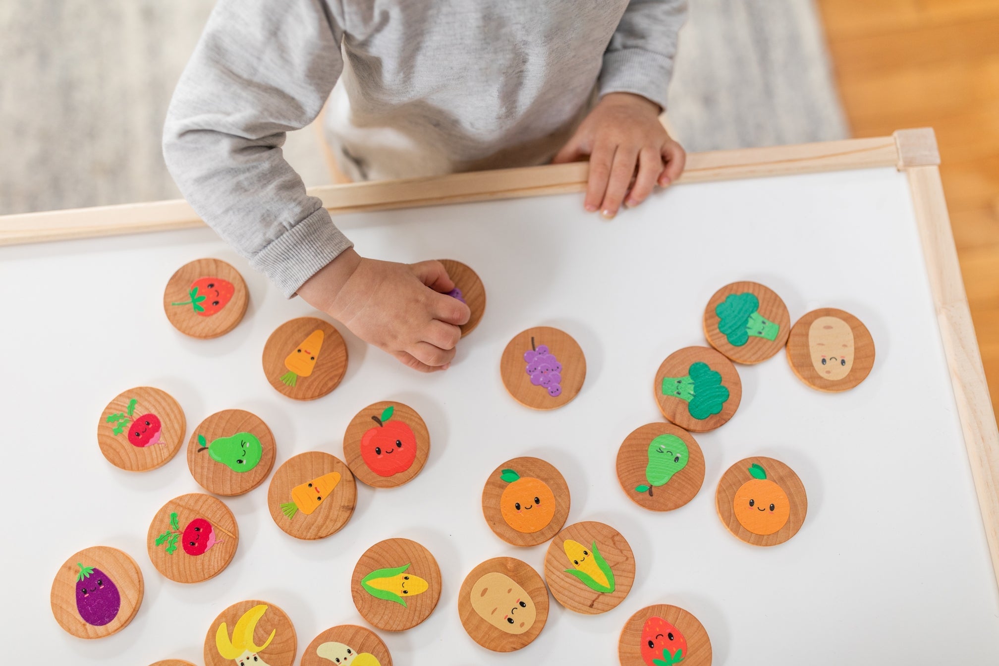 The fun fruits and veggies on our Farmer's Market Matching Tiles will make your child smile!  A fun game that can be enjoyed solo or with the entire family - teaching kids to take turns and share with others.  Our wooden matching tiles will also promote short term memory skills.  This set features 12 pictures of easily recognizable produce items: carrot, strawberry, corn, pear, orange, potato, radish, eggplant, apple, banana, grapes, and broccoli.