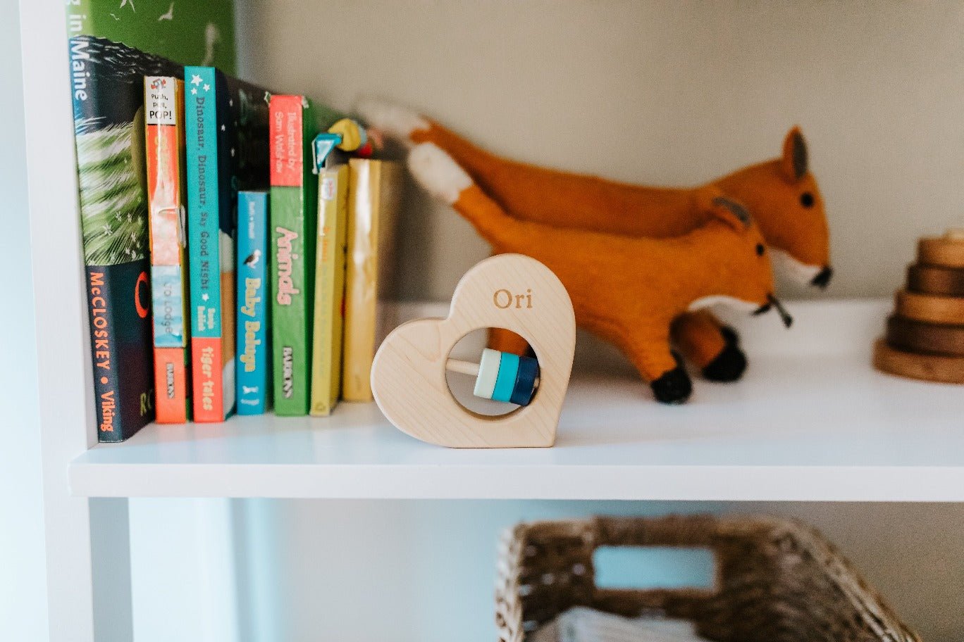 The Heart rattle is perfect to show your little one some love.  This rattle is organic and natural.  The heart is made in light Maple wood and finished with our own special mix of organic beeswax and flax seed oil making this toy both beautiful and durable.  And at 4.75 inches, it is the perfect size for your little one's hands.  Choose any 3 disk colors!