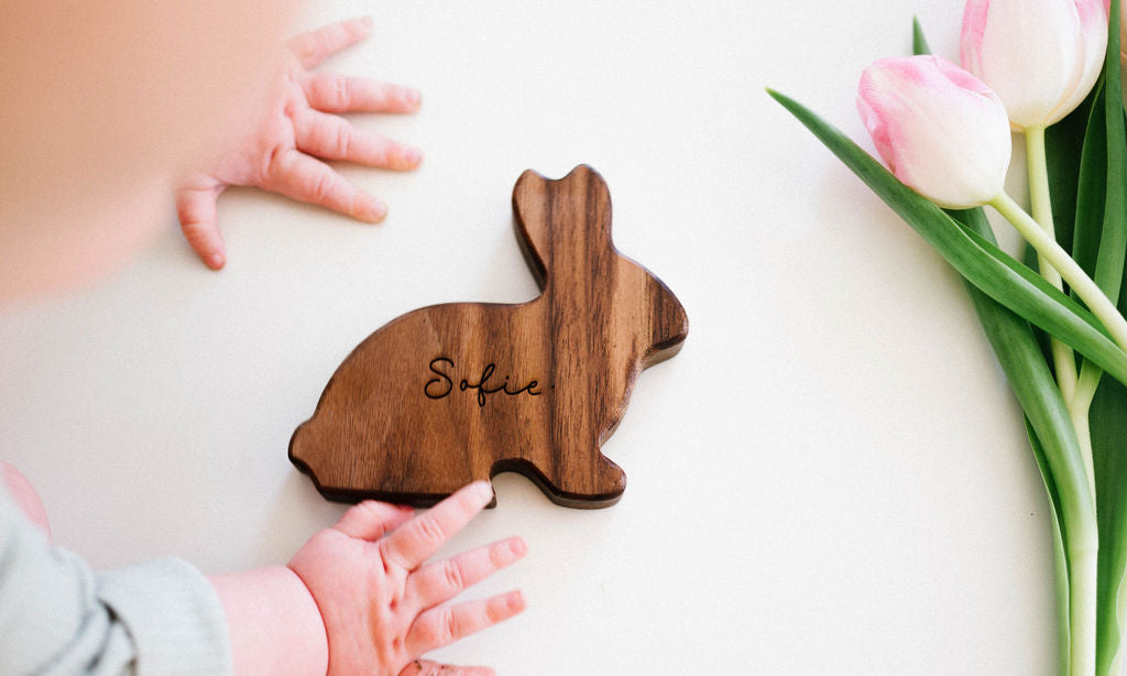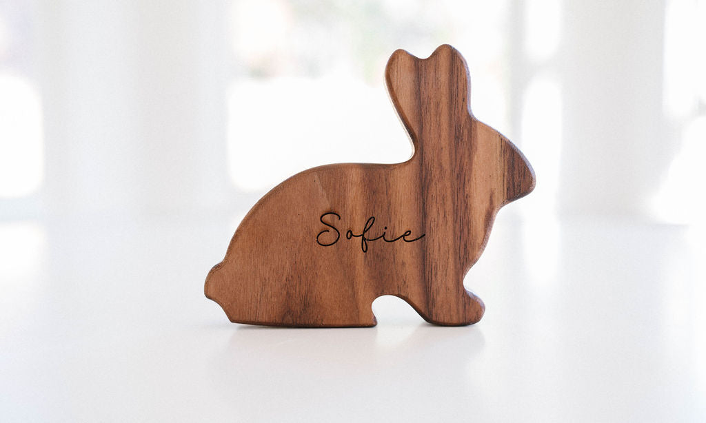 This "Chocolate" bunny is sure to make your Easter celebration even more fun! Give it a little shake for a soft rattle sound that everyone can enjoy. This rattle is organic and natural.  The bunny is made from walnut wood and finished with our own special mix of organic beeswax and flax seed oil making this toy both beautiful and durable.  And at 4.75 x 4 inches, it is the perfect size for your little one's hands.