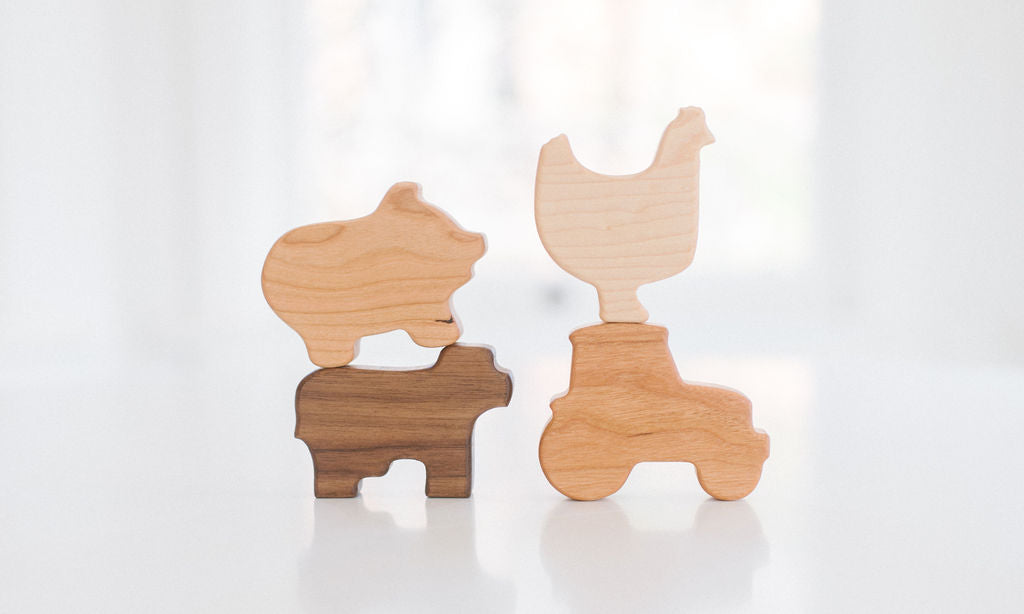 All of our wooden toys are 100% made here in the United States. Our workshop is in our hometown of Madrid, Iowa. All of our lumber is sourced from Iowa and the Midwest. The few parts that we do not make ourselves such as wood rings are made by companies in Texas, Illinois, Ohio, and Maine.