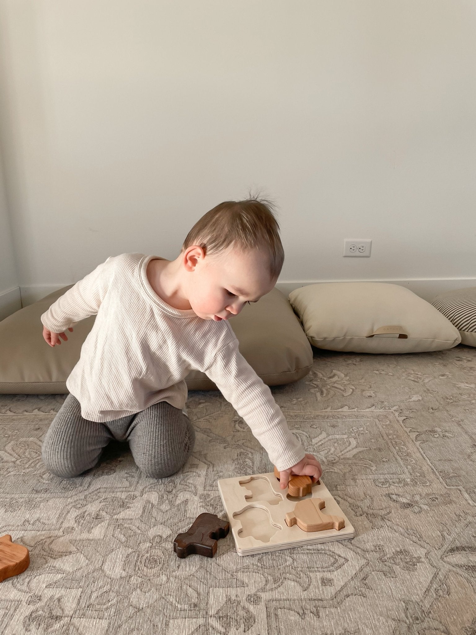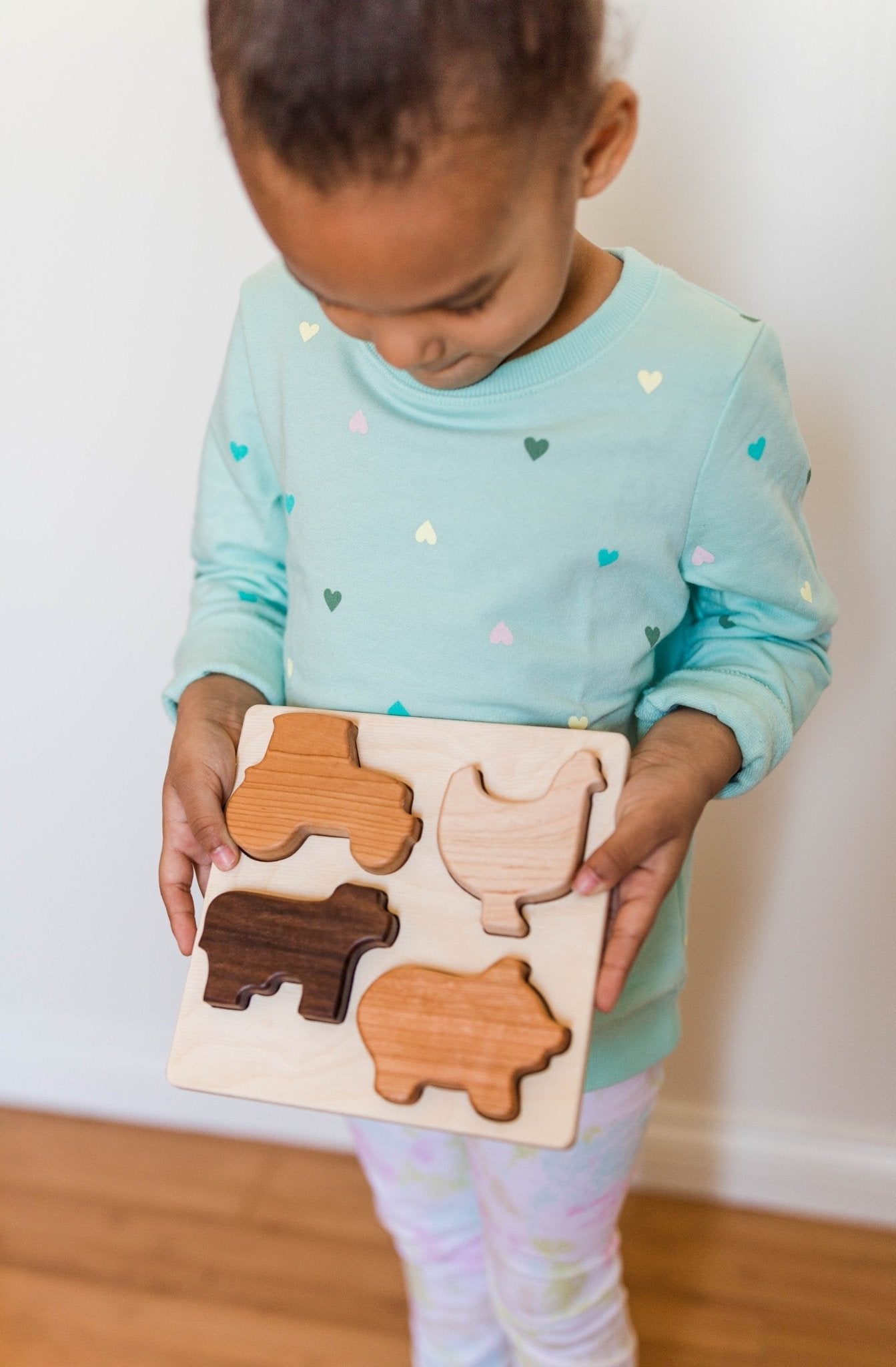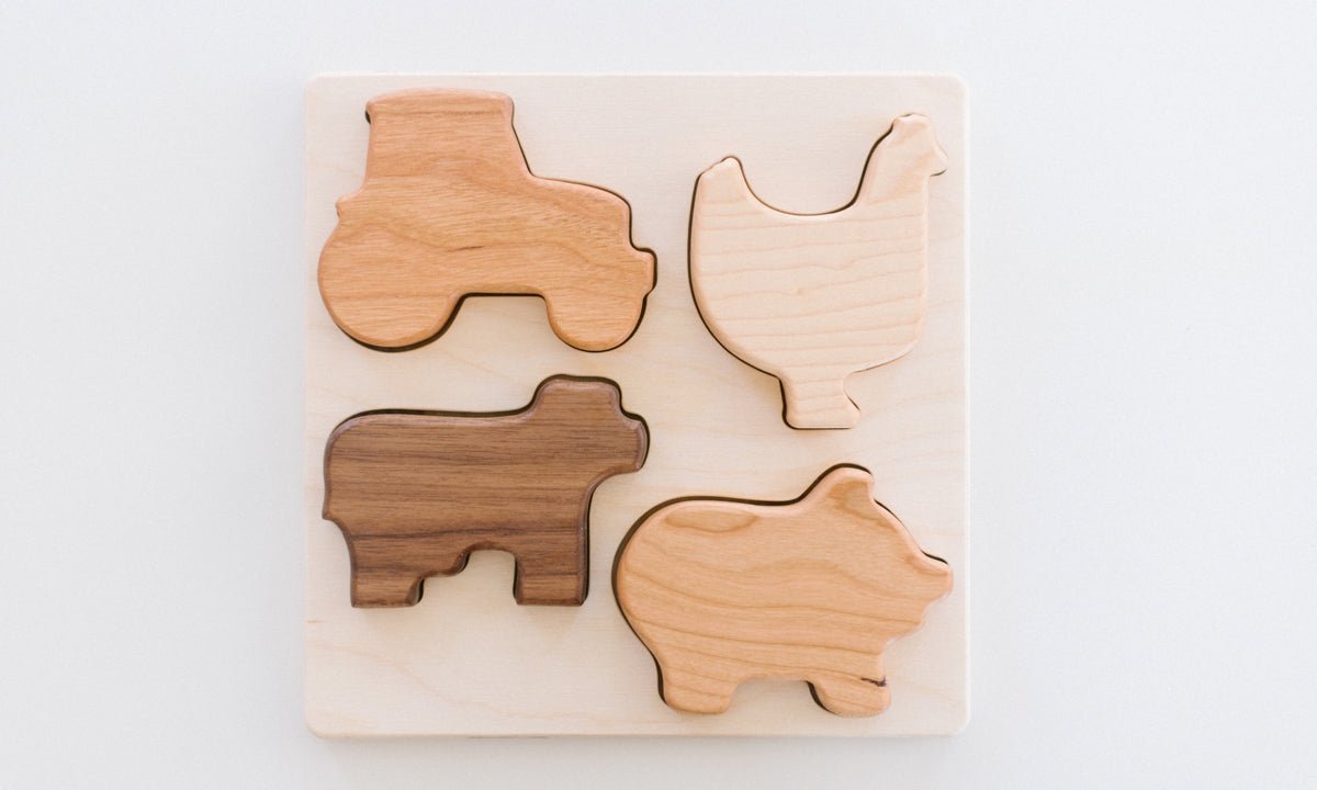 Help your little one work on hand-eye coordination with our gorgeous new farm puzzle. Made with chunky shapes it is easy for little hands to grasp them and fit into the correct spot. Benefits of puzzles go beyond just shape recognition and working on hand-eye coordination, your little one will be learning about spatial relation + reasoning as well as problem-solving.