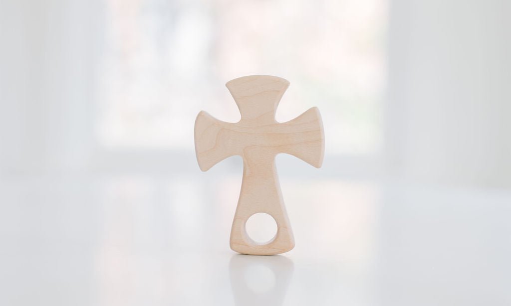 All toys come sanded satin smooth and left natural with no finish.  The cross is approximately 4" x 3" with a grasping hole in the center.