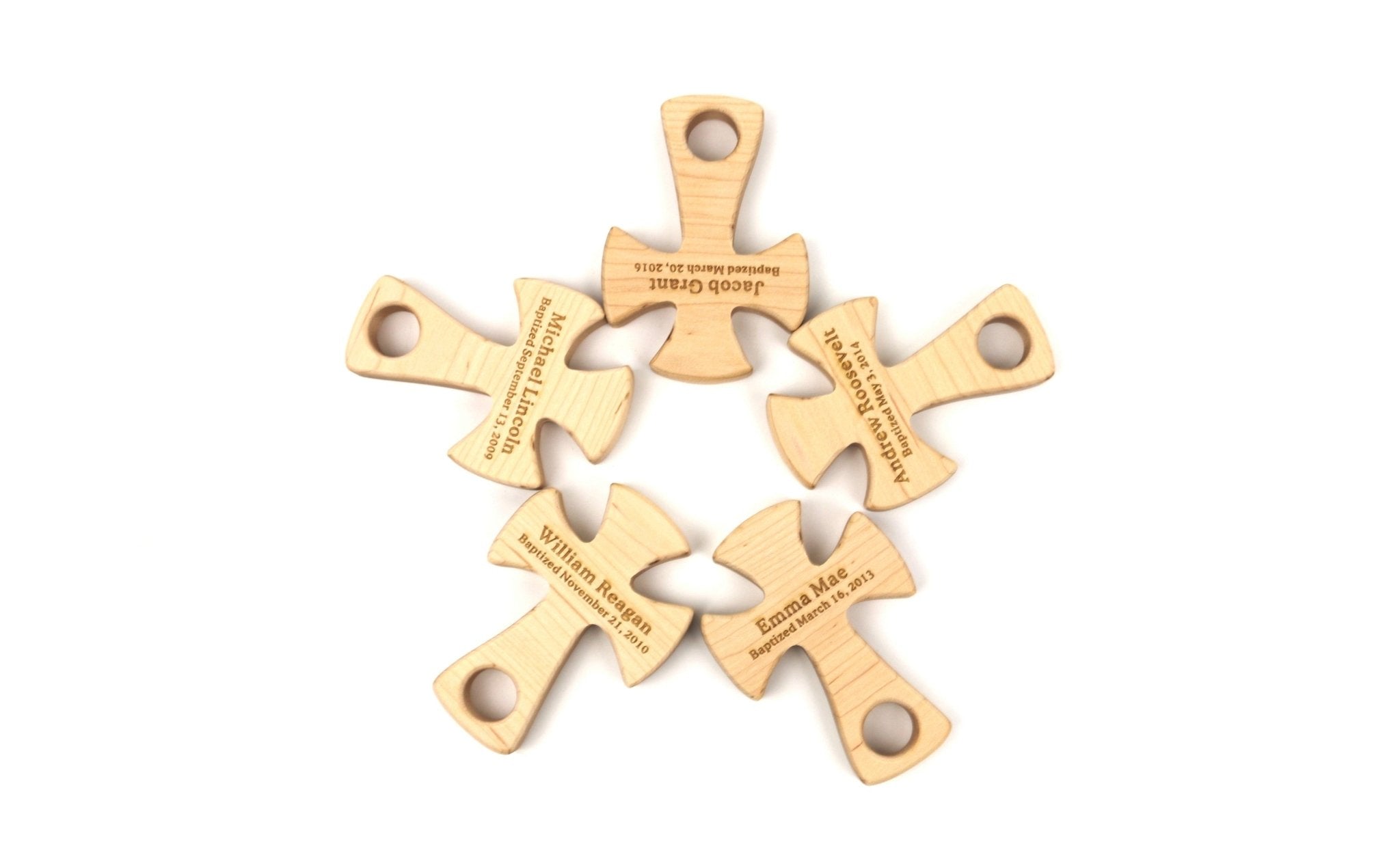 All toys come sanded satin smooth and left natural with no finish.  The cross is approximately 4" x 3" with a grasping hole in the center.