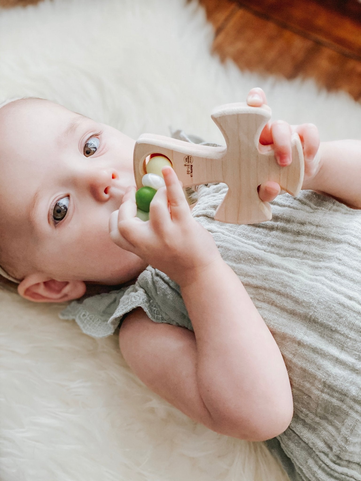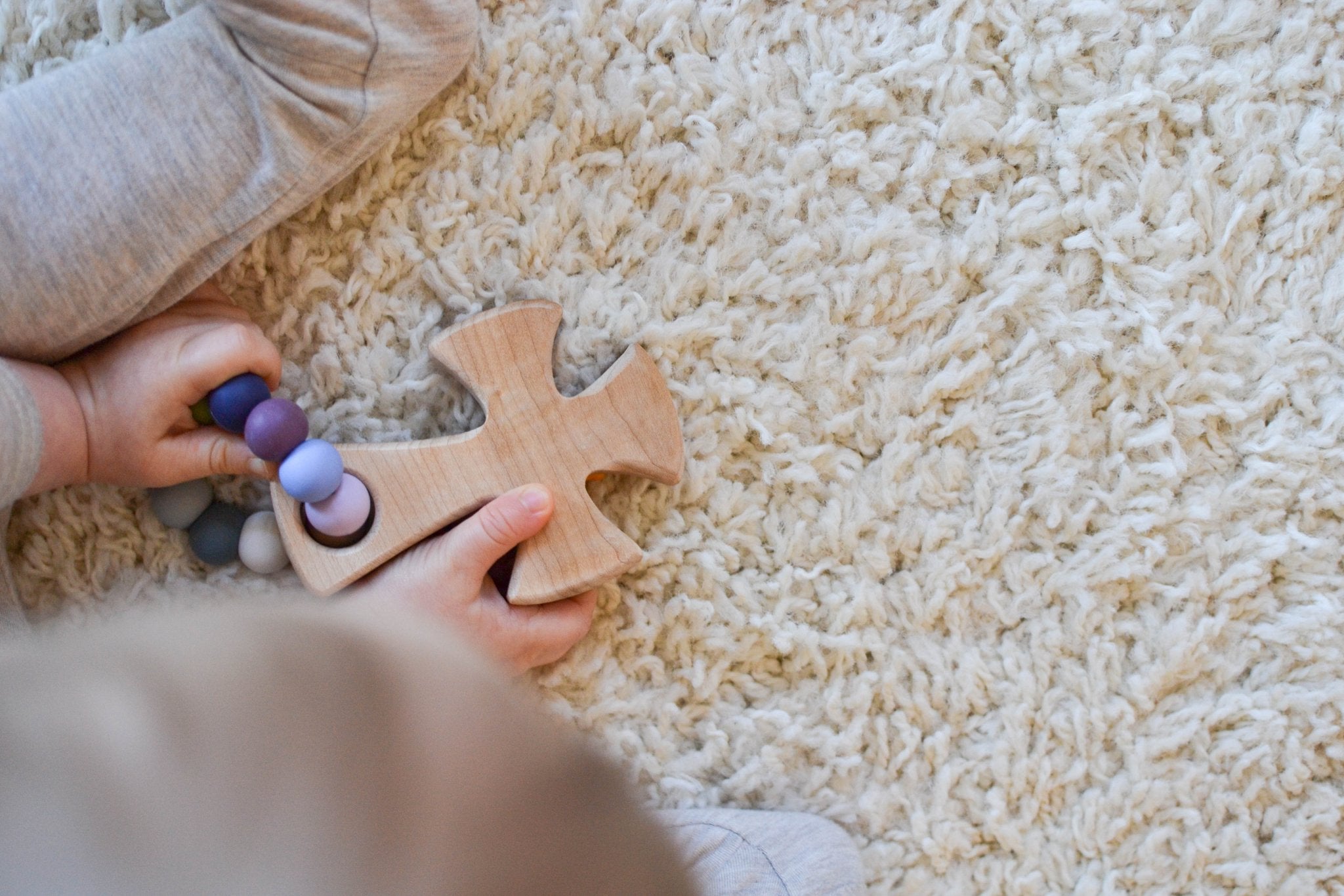 The cross grasping toy is made using hard maple which is naturally resistant to bacteria and it is non-splintering wood, so it's safe for baby to play with for hours!  Its lightweight and easy to hold, working on all those gross motor skills that are so important early on! The silicone beads make for an added texture and extra soothing sensation!   Just tell us what color beads to add from the drop down.