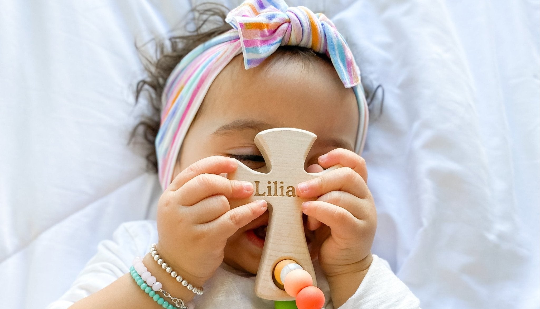 -Leave the grasping toy plain, or have it permanently laser engraved with a single word, 2 words, or baptism/dedication information. If personalization is selected please tell us what to inscribe in the notes box.