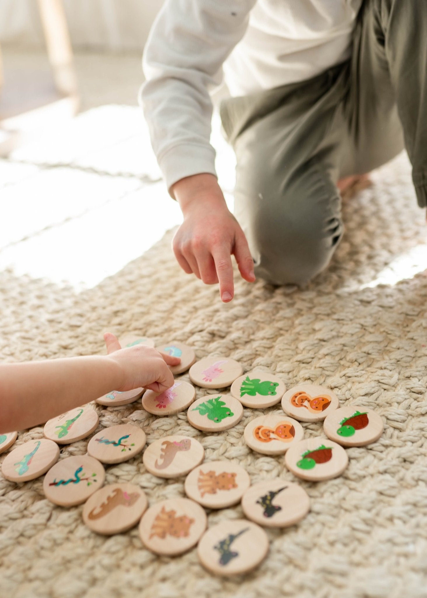 Be as cool as a reptile with this matching game! Your next adventure is just a slither away with our Reptile Matching Tiles. This memory matching set consists of 12 cute and crawly reptile designs on 24 wooden tiles. It can be enjoyed solo or with the entire family - teaching kids to take turns and share with others.  Our wooden matching tiles will also promote short term memory skills.