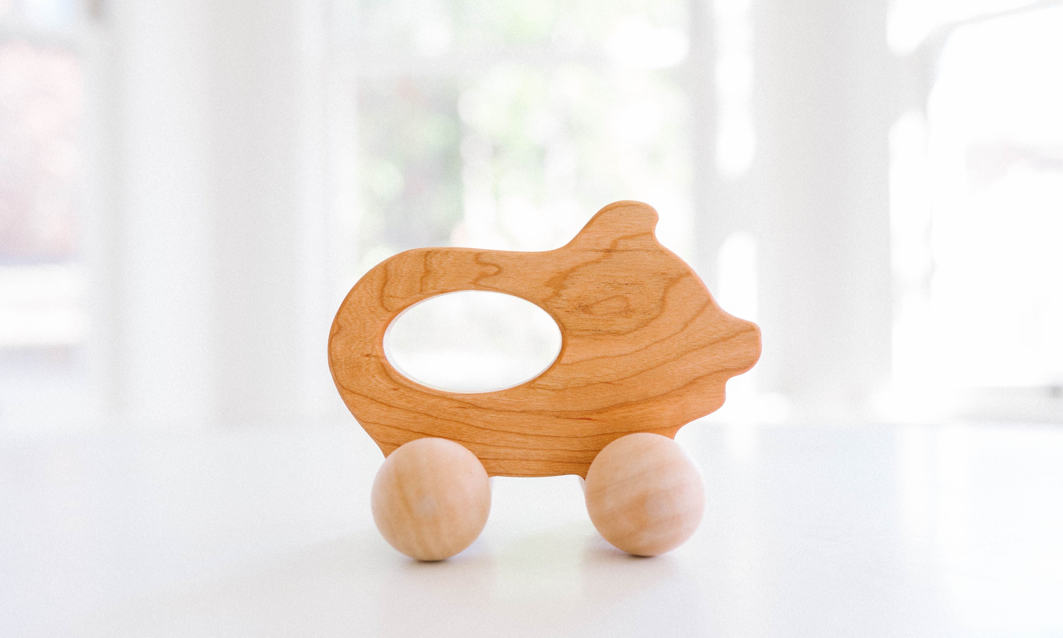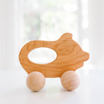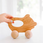 Encourage active play with our wooden push toy Piggy. Handcrafted from cherry hardwood , it features an interior cutout that makes an easy "handle" for little fingers to grasp. Fun for babies and toddlers alike, this toy helps to develop motor skills and hand-eye coordination. It is finished with a mix of beeswax and flaxseed oil.