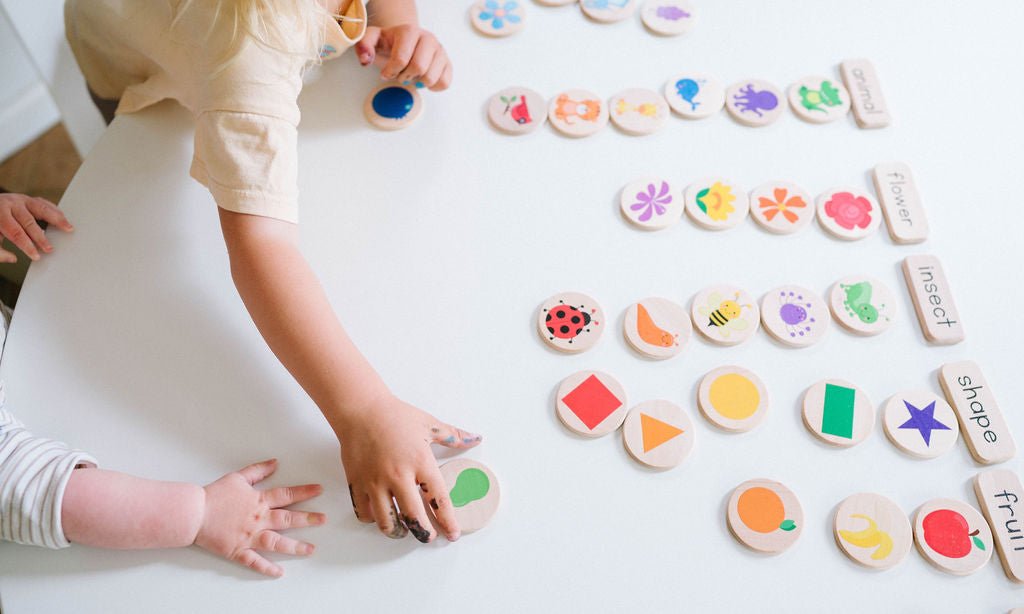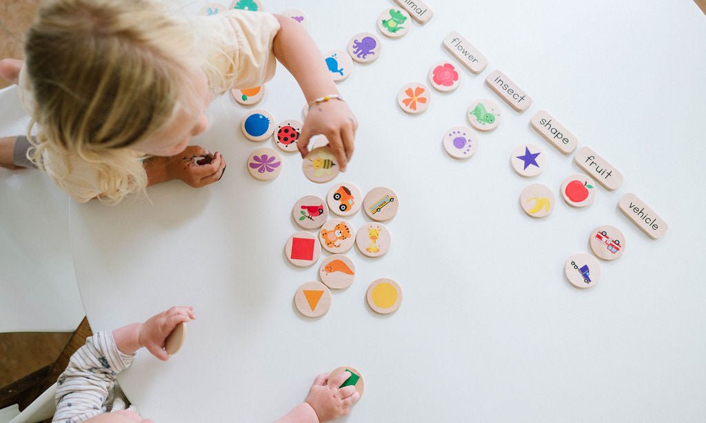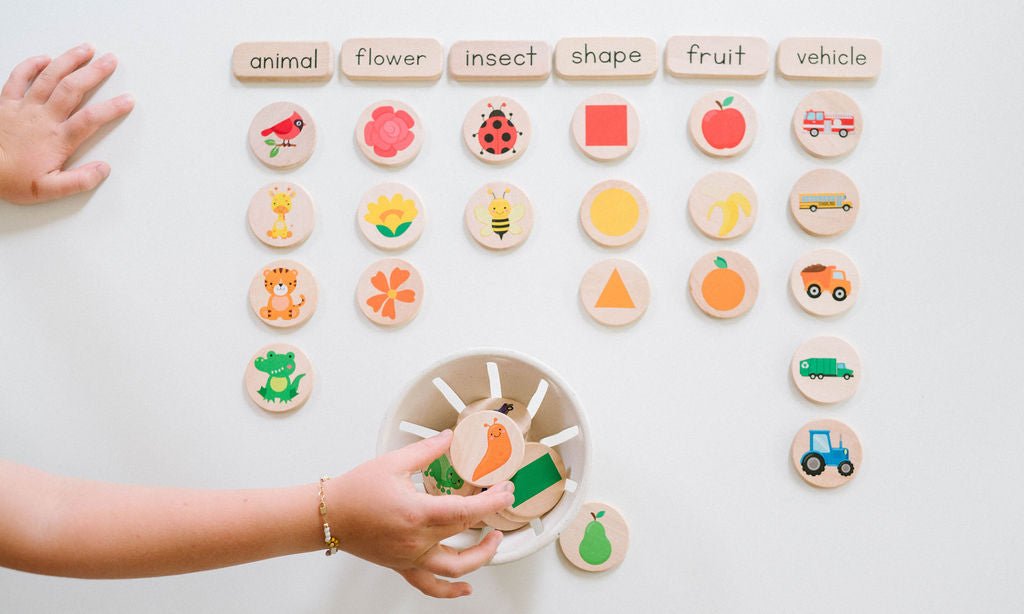 The name of the game is....SORTING!! Sort by color, animal, flower, insect, shape, fruit and vehicle all in ONE game! Each set comes with 6 double sided rectangle tiles with the sorting words and 36 round tiles with the pictures to sort.